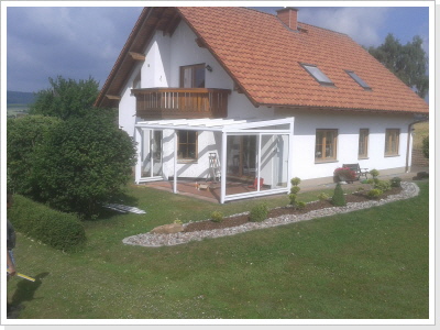 Die Terrasse ist jetzt windgeschützt, wobei beide Stirnseiten über die installierten Schiebetüren geöffnet werden können. Zwei der Dachsparren sind mit jeweils 3 Stück Spots ausgerüstet.